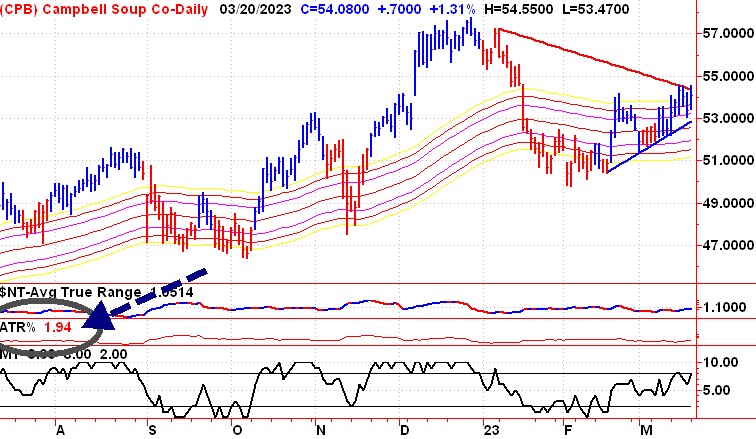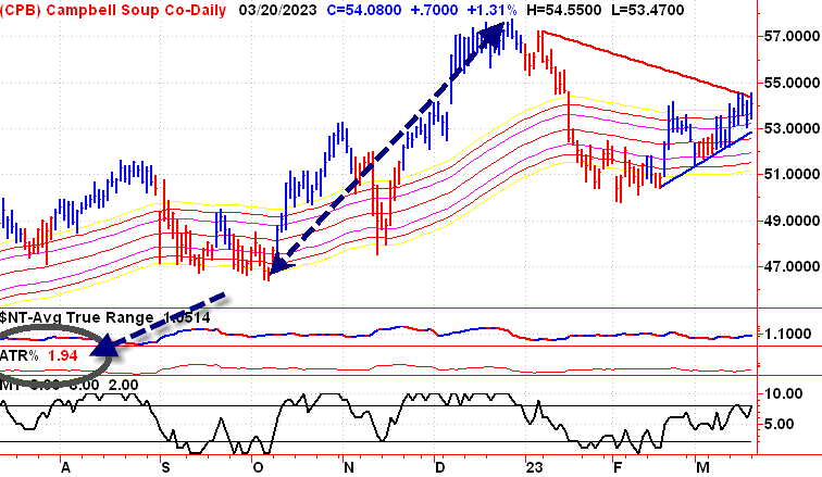 Comment cela se compare-t-il à une autre action qui commence par la lettre C ? Si nous regardons Conoco Phillips, il a actuellement un % de fourchette réelle moyenne de 4,07 %. Plus du double de l’ATR actuel pour Campbell Soup. Notre hypothèse basée uniquement sur ce chiffre et sans regarder le graphique est que cette action serait beaucoup plus risquée, mais aurait un potentiel de gains en capital beaucoup plus élevé. Voyons ce que l’activité commerciale récente nous dit.
