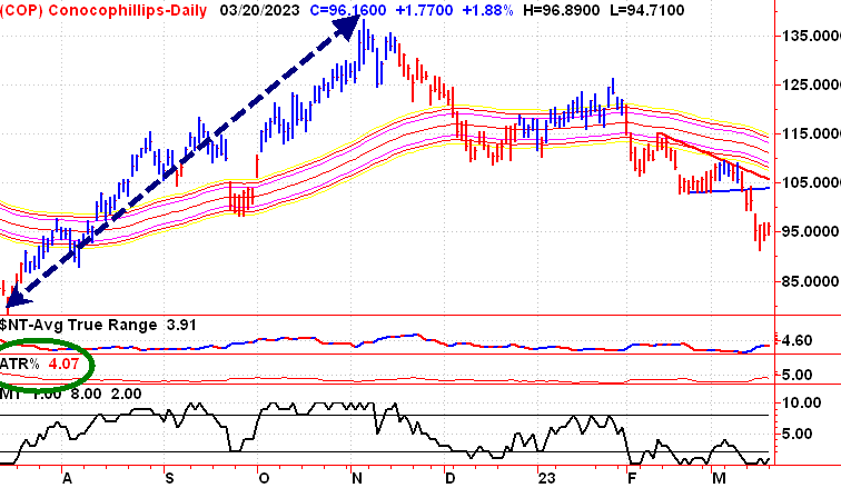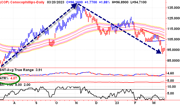 Bien sûr, il y a le revers de la médaille. Une action avec un ATR plus élevé a également un potentiel de perte en capital plus important. Dans cet exemple, en mesurant du pic au creux récent, Conoco Phillips a perdu 33,9 %.