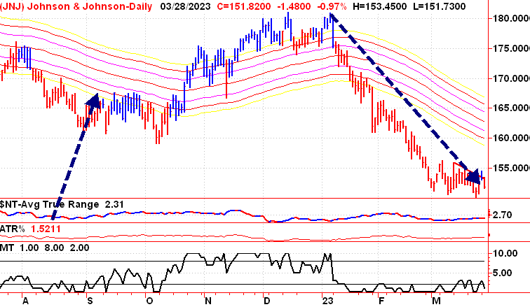 Voici maintenant un exemple d’un titre avec un canal Flypaper beaucoup plus large qui correspond à une plage réelle moyenne beaucoup plus petite d’un peu plus de 1,5 %. Dans cet exemple, lors d’une énorme baisse, il a fallu 3 mois pour que ce titre baisse de 20 %.