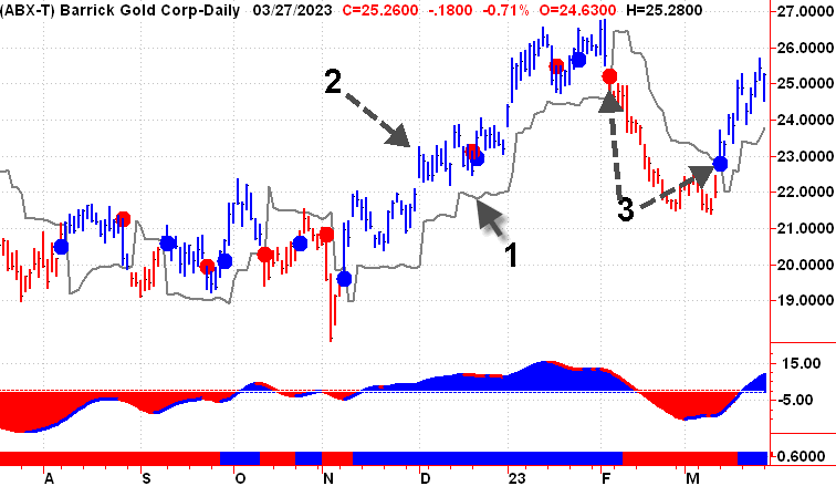 The initial closure above the trend line (1) is a buy signal in this simple to use technique. And a sell signal is generated by the first close below the trend line. The color of the bars on the chart also changes when the trend does. Red bars denote a decline, whereas blue bars denote an uptrend (2).